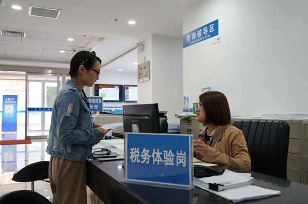 图为“税务体验师”体验导税岗和公开电话接听岗,解答纳税人关于减税降费等涉税问题。