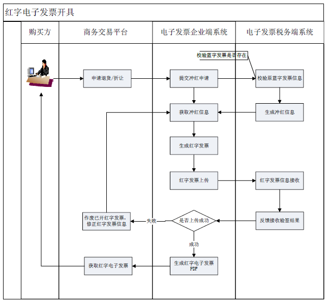 当发生退货、错票(购买方填写客户名称或开票内容错误)或折让需要开具红字发票时,购买方在商务交易平台上提出退货申请或者错票冲红申请或者由销售方向购买方发起折让通知;商务交易平台将退货或错票或折让过程中的交易信息发送给电子发票企业端系统,电子发票企业端系统发起冲红申请并提交至电子发票税务端系统;电子发票税务端系统自动校验是否可以对原蓝字发票冲红,校验通过后生成冲红信息,并将冲红信息返回给电子发票企业端系统;电子发票企业端系统根据税务端返回的冲红信息开具红字发票,开具后将红字发票开具信息上传至电子发票税务端系统,同时将红字发票推送至商务交易平台,完成红字发票开具。