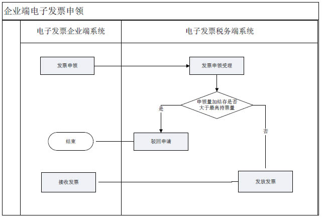 企业可以根据电子发票使用的实际情况(低于临界值),进行发票申领,电子发票税务端系统对申领企业的发票申领量加结存量是否大于最高持票量进行判断,如大于最高持票量,则申领失败;如小于最高持票量,则发放电子发票,电子发票企业端系统可以接收电子发票到开具电子发票的税控设备中,电子发票申领流程如下: