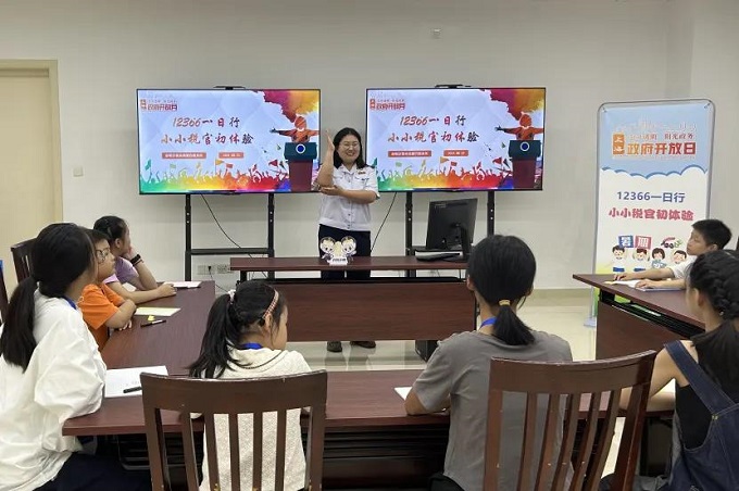 近日,崇明区税务局组织开展政府开放月“12366一日行,小小税官初体验”暑期实践活动,邀请中小学生化身“小小税务体验官”走进话务大厅,通过沉浸式、互动式、体验式活动零距离感受基层税务干部的日常工作,鼓励青少年学习税法知识、培养税法意识。