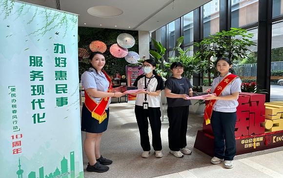 线下,在KING88“蒲公英”楼宇税收服务站,税务干部引导现场的纳税人,体验在自助办税终端个人纳税清单打印,在电子税务局填写纳税申报表,纳税人表示:“小小的楼宇税收服务站功能还不少,原本需要前往办税服务厅才能完成的事项现在在楼宇里就可以完成。”