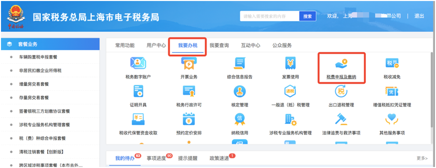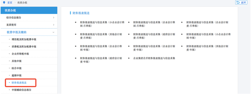 第一步:登录上海市电子税务局,点击【我要办税】—【税费申报及缴纳】—【财务报表报送】,选择需要更正的对应财务报表种类。