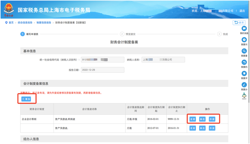 若之前已有财务会计制度备案信息,则会显示会计制度备案信息列表,可以进行【查看】、【修改】、【作废】等操作。