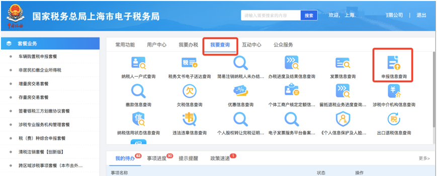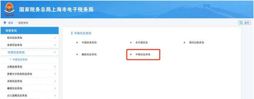 第一步:登录上海市电子税务局,点击【我要查询】—【申报信息查询】,点击页面右侧【申报信息查询】。