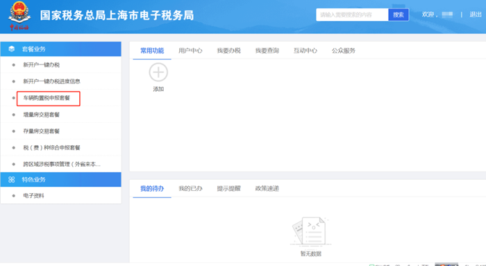 通过电子税务局,选择自然人登录后,点击左侧菜单栏的“车辆购置税申报套餐”。