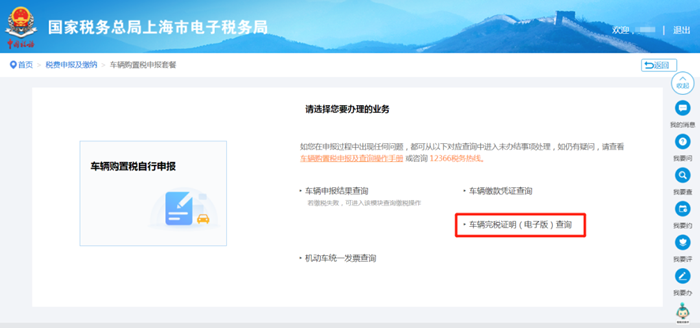 通过【公众查询】中的【车购税完税证明(电子版)】模块免登录查询打印完税证明(电子版)。