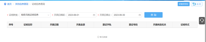 点击【车辆完税证明(电子版)查询】,进入该模块后,证明种类中下拉框选择“车购税完税证明”,输入查询车辆的车辆识别代号,确认开具日期起止,点击“查询”。